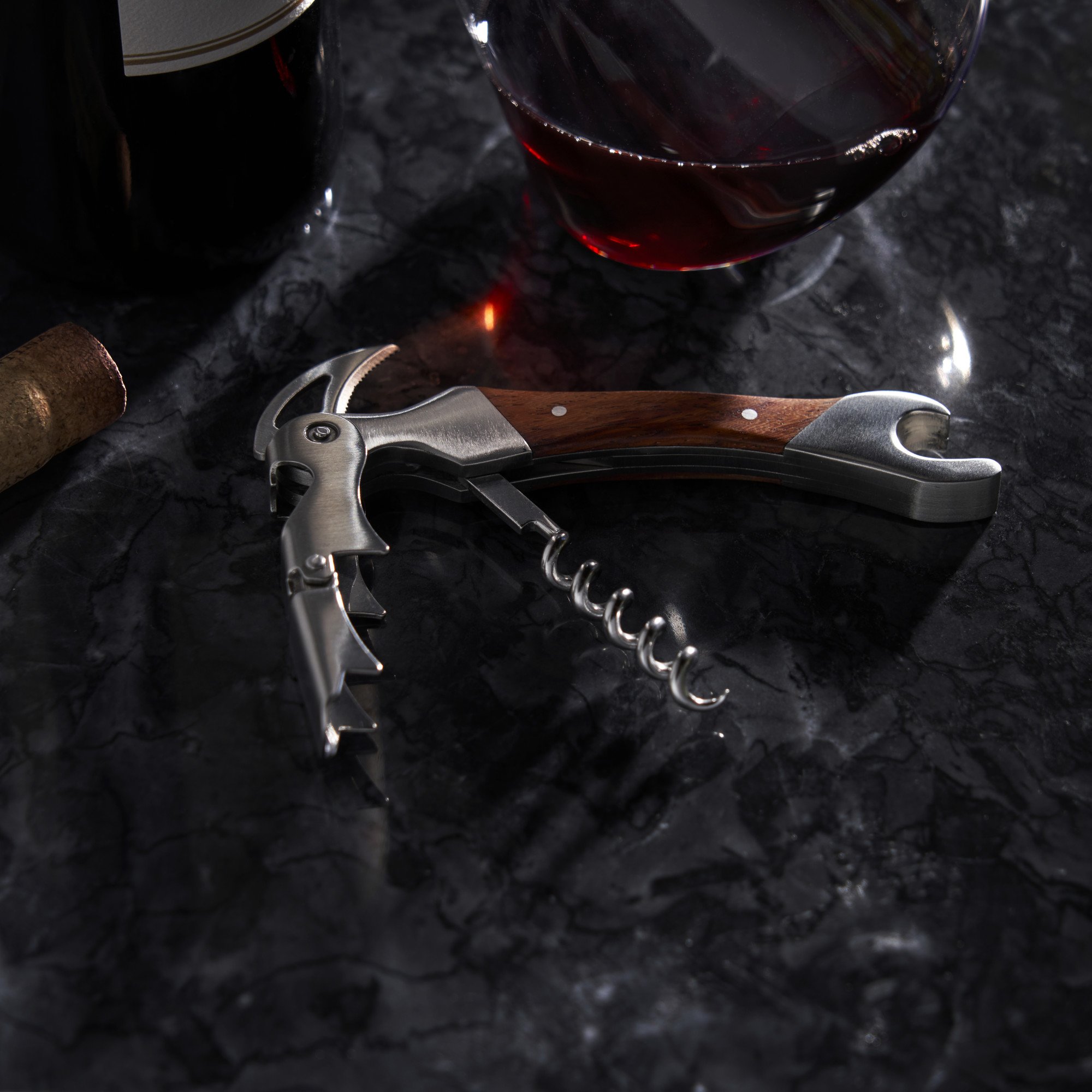 Discover an oversized corkscrew that opens any wine bottle with ease. Tired of removing corks with sub-par tools? Our corkscrew comes with all the necessary features to pop corks with ease and class. Whether you enjoy entertaining from home or you work in a wine restaurant, this wood-handled corkscrew is sure to add extra class to the cork popping experience. The corkscrew features a sharp 5-turn worm that buries deep into the cork, without causing any crumbling. The stainless-steel mechanics create a durable corkscrew that will last a lifetime. 5-turn, non-stick worm Stainless steel and wood inlay Serrated foil cutter Double-hinged Includes bottle opener Easy-grip A fantastic gift – This wine opener is the ideal gift for any wine enthusiast who is partial to a glass (or three). Along with a bottle of their favorite wine, gift this wine accessory gift to that special person in your life.