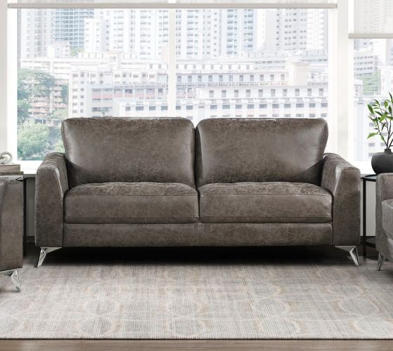 Elegant modern styling is achieved in the design of the Cazon Collection making its addition to your living room a perfect complement to your home's decor. The lines of sofa's profile create definition in their simplicity - from the seat cushions to the polished silver finish of the support legs. The collection is covered in brownish gray polished microfiber.PRODUCT DIMENSIONS: Overall Dimension: 77" x 35" x 33.5"HSeat Width: 64"Seat Depth: 21.5"Seat Height: 18.5"Arm height: 24"Doorway width: 19"Listing Includes: One Sofa Only.Loveseat and Chair: Not Included.Simple Assembly Require.