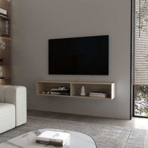 FM FURNITURE Central Floating media rack in melamine with two shelves,white oak"Transform your living room with our stylish and functional media rack, expertly designed to enhance your viewing experience. This wall unit is made from high quality melamine and particle board, making it highly durable. With two spacious shelves, it offers ample space to neatly organise all your TV accessories. The streamlined design not only saves floor space, but also places the TV at an ideal height for optimal viewing. Perfect for any contemporary home, this TV stand combines style and convenience to create the ultimate entertainment zone.DIMENSIONS (59.1''W X 12.6''D X 10.4''H)."