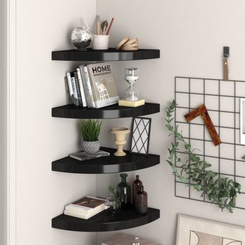This set of 4 stylish corner shelves is ideal for displaying your favorite books, decoratives, photos, awards, etc.