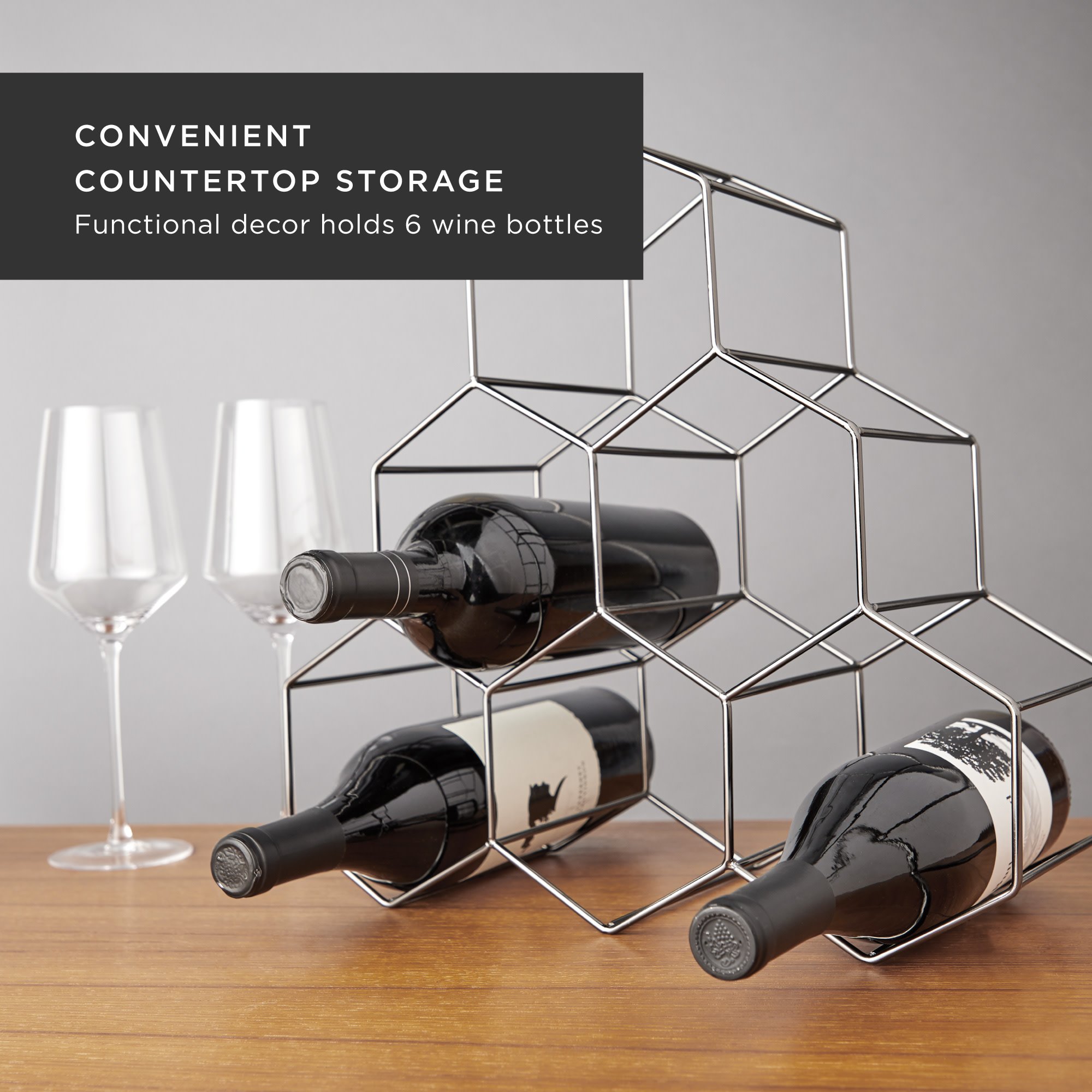 An excellent selection of wine deserves to be displayed in style. Gunmetal-plated iron is wrapped and welded to form this stunning six bottle wine rack, perfectly suited for tabletops, countertops and that meticulously curated bottle collection. Geometric honeycomb design Gunmetal-plated iron Holds 6 standard wine bottles 14.25" x 15" x 6" Stylish and practical, this glamorous wine rack brings subtle elegance to your home decor. Upgrade your barware with Viski’s professional-quality home bar accessories.