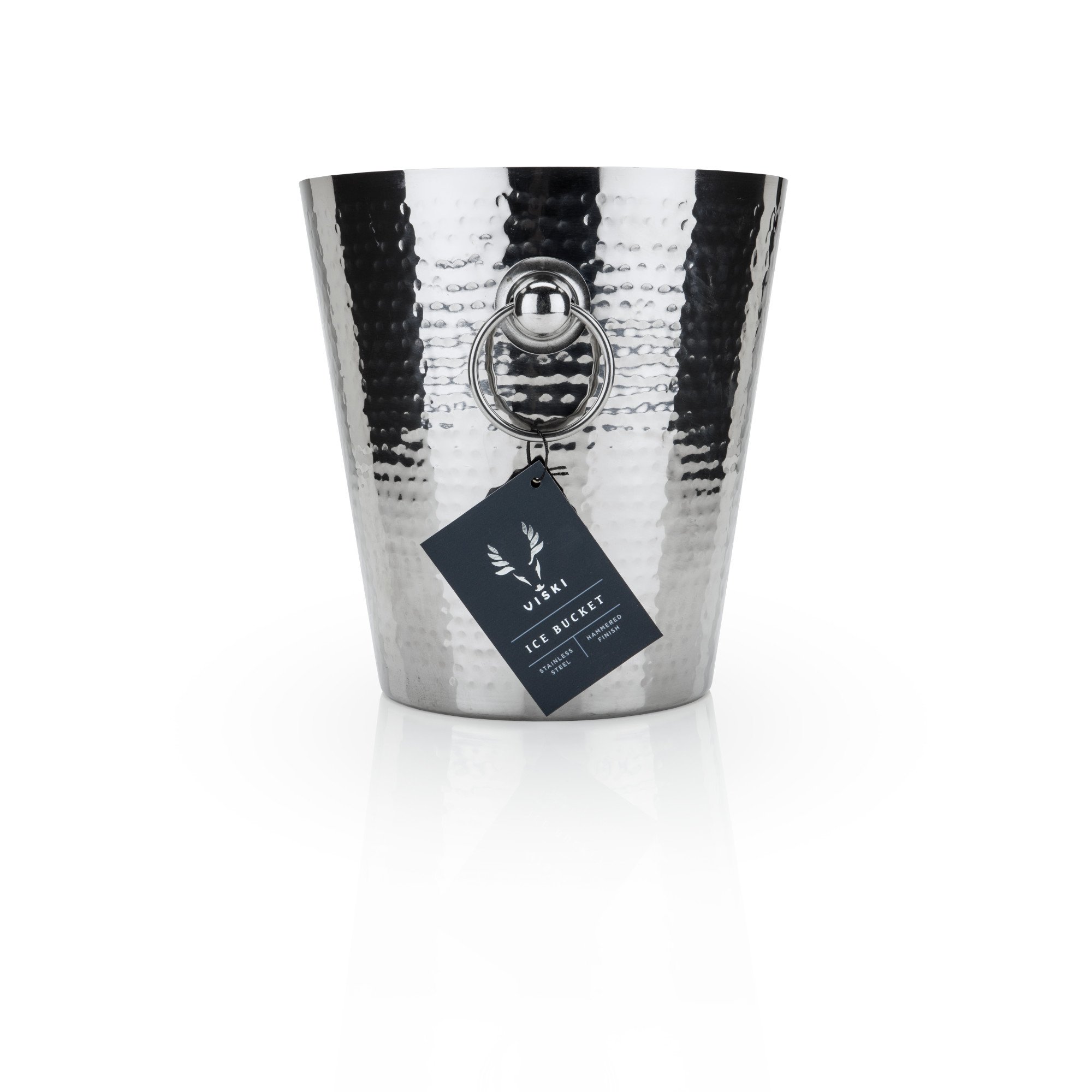 In the Forge Hammered Metal Ice Bucket, classically sculpted stainless steel is broken up by powerful blows for a hammered finish, resulting in sleek lines with just enough variation to capture the light necessary for showcasing your wine. Stainless steel metal tub Hammered finish Handles (dimensions?) Stylish and practical, this ice bucket brings subtle elegance to your drink experience. Upgrade your barware with Viski’s professional-quality home bar accessories.