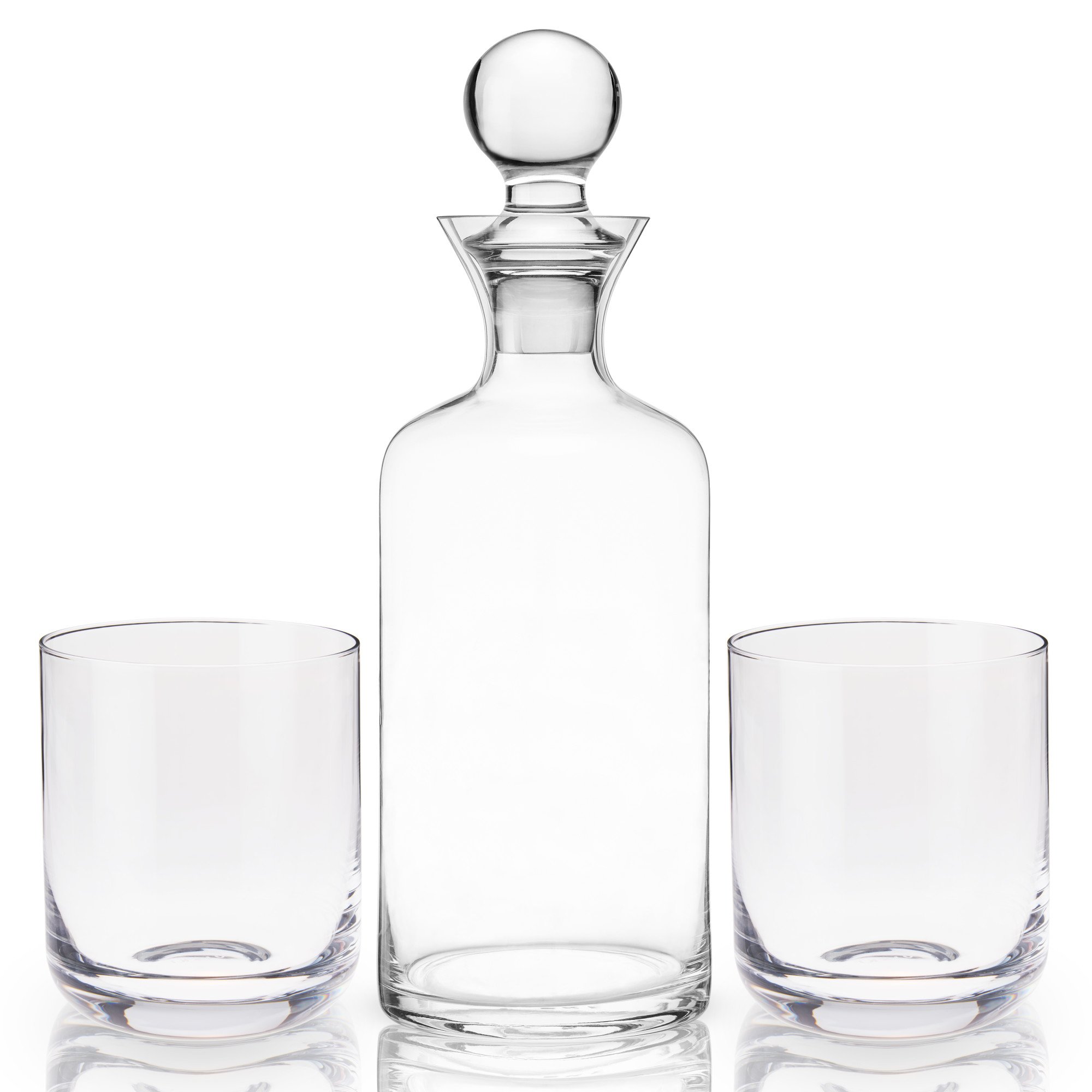 Hand-blown with pristine lead-free crystal, this gift set has superb weight and clarity— a perfect trio to elevate your favorite aged spirits. Includes the sleek decanter, rounded stopper, and two coordinating tumblers to serve and display your liquors at their best.