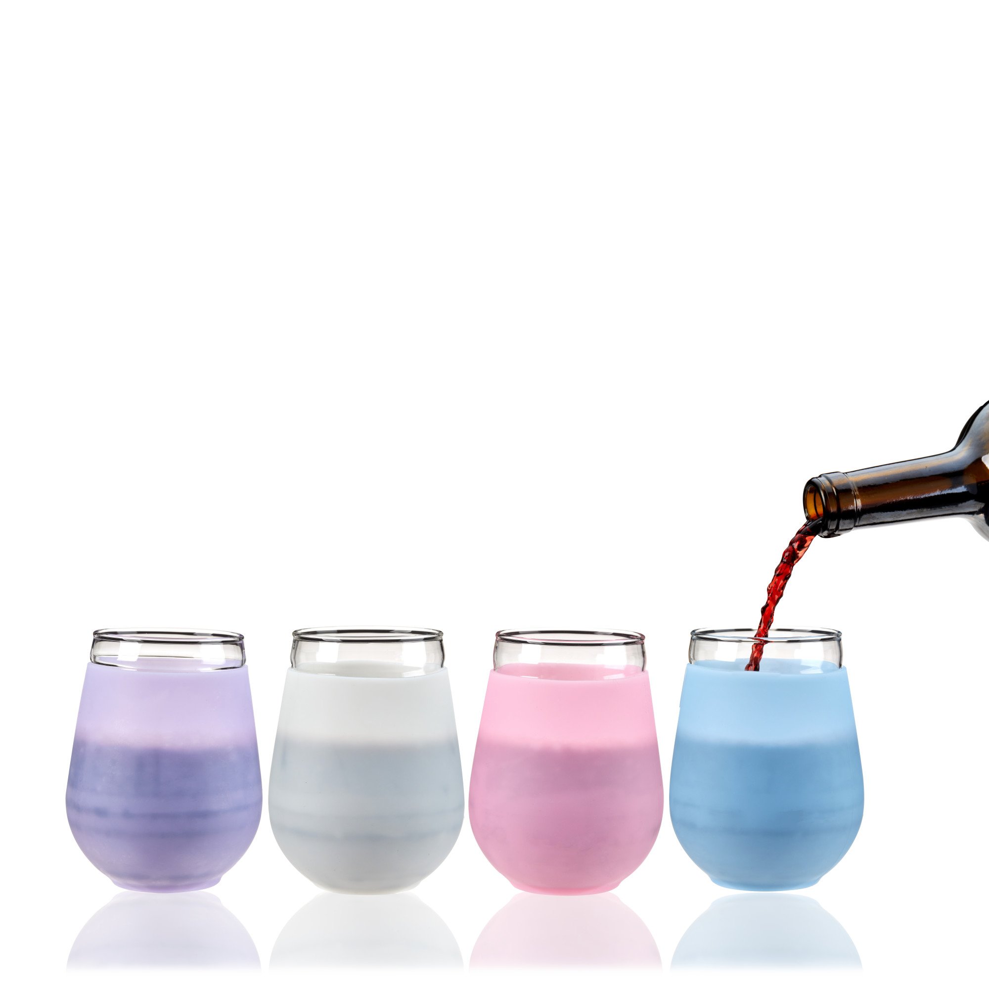 Wrapped in smooth, easy-grip silicone, the Flexi Wine Glasses provide base stability in a trendy color palette. A clean and functional design makes these durable and perfect for both outdoor and indoor gatherings. Dishwasher safe, top rack only. 16 oz capacity. 4 trendy colors.