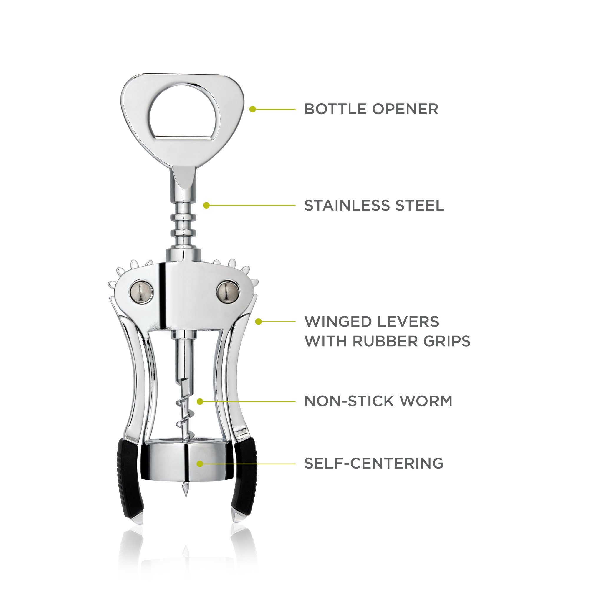 Winged corkscrews are one of the most popular styles of corkscrew for a reason. Our Spiral winged corkscrew enhances the usual design with comfortable rubber-grip arms. What can we say? It’s pretty fly. Simply place the corkscrew on top of your wine bottle, hold the frame in one hand and twist the handle to insert the corkscrew into a cork. Hold securely and push the wings down to easily remove any cork, natural and synthetic alike. All metal frame construction Lever arms Rubber-grip wings Integrated bottle opener