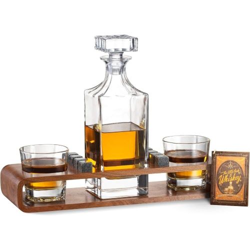• ✔ All-In-One Whiskey Decanter Set Everything your home bar needs in one attractive bourbon decanter set! The classic mahogany stand holds 2 heavy-bottomed whiskey glasses (10oz), whiskey decanter, velvet carrying bag, 8 whiskey stones, stainless steel tongs, and whiskey cocktail cards.